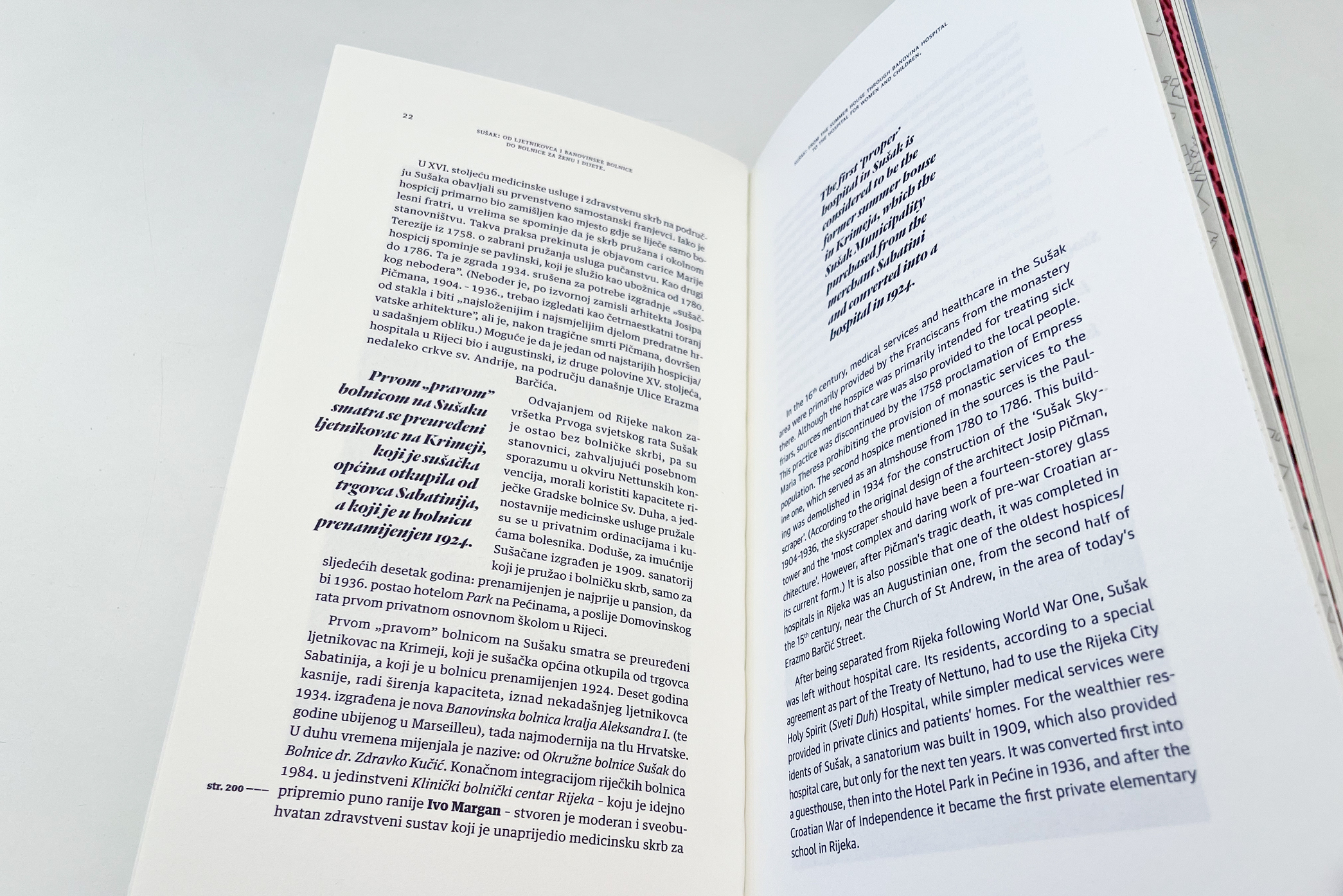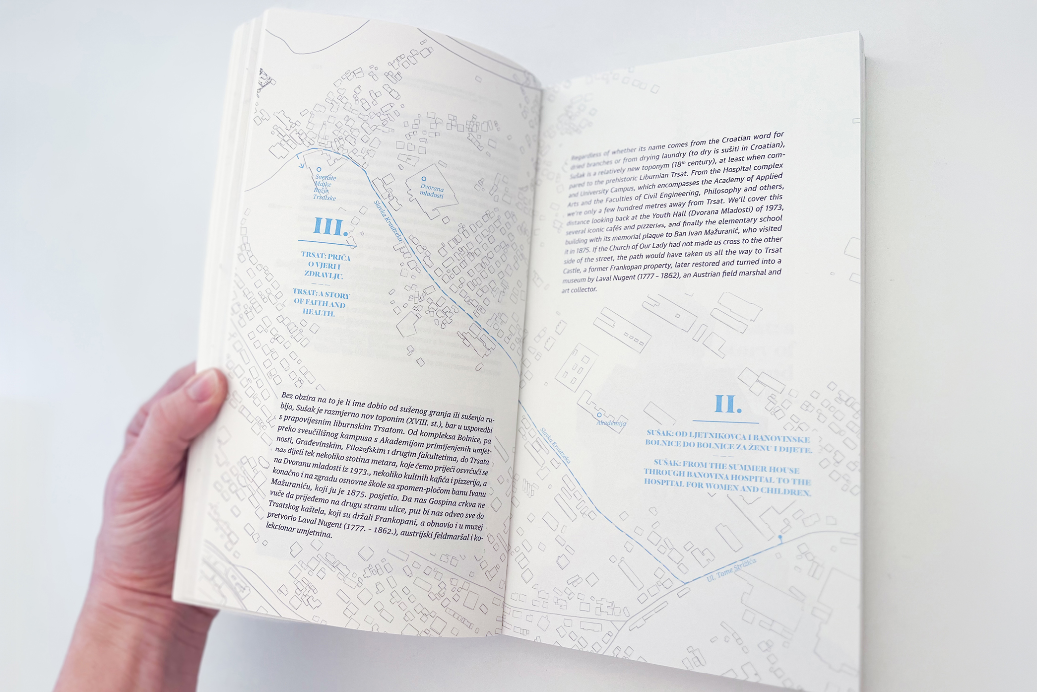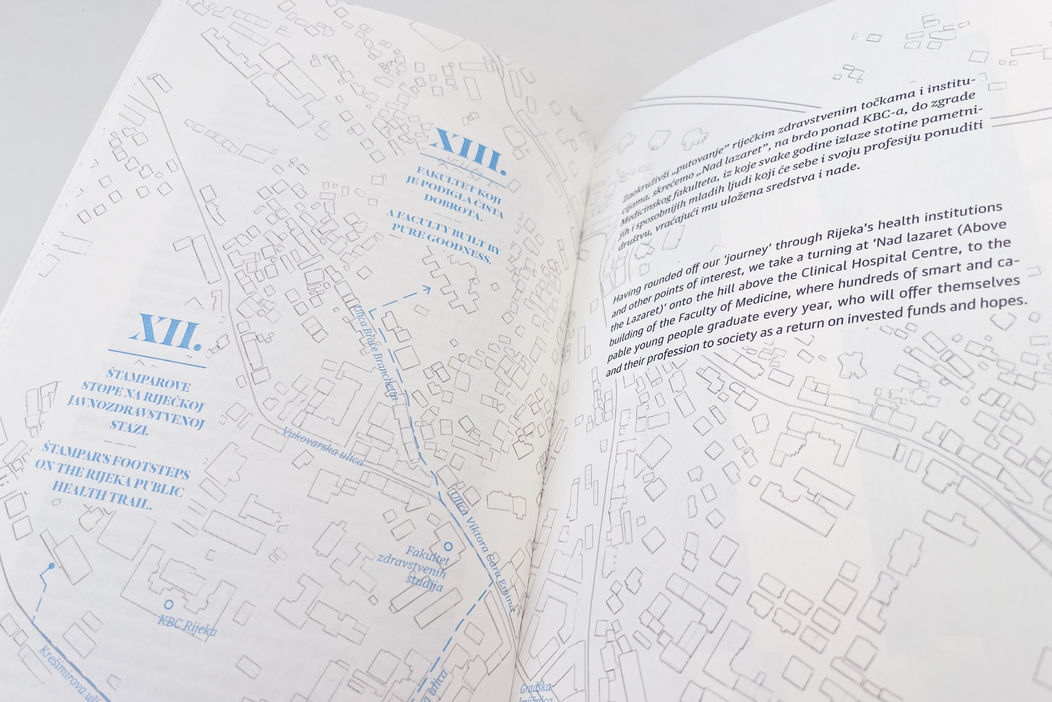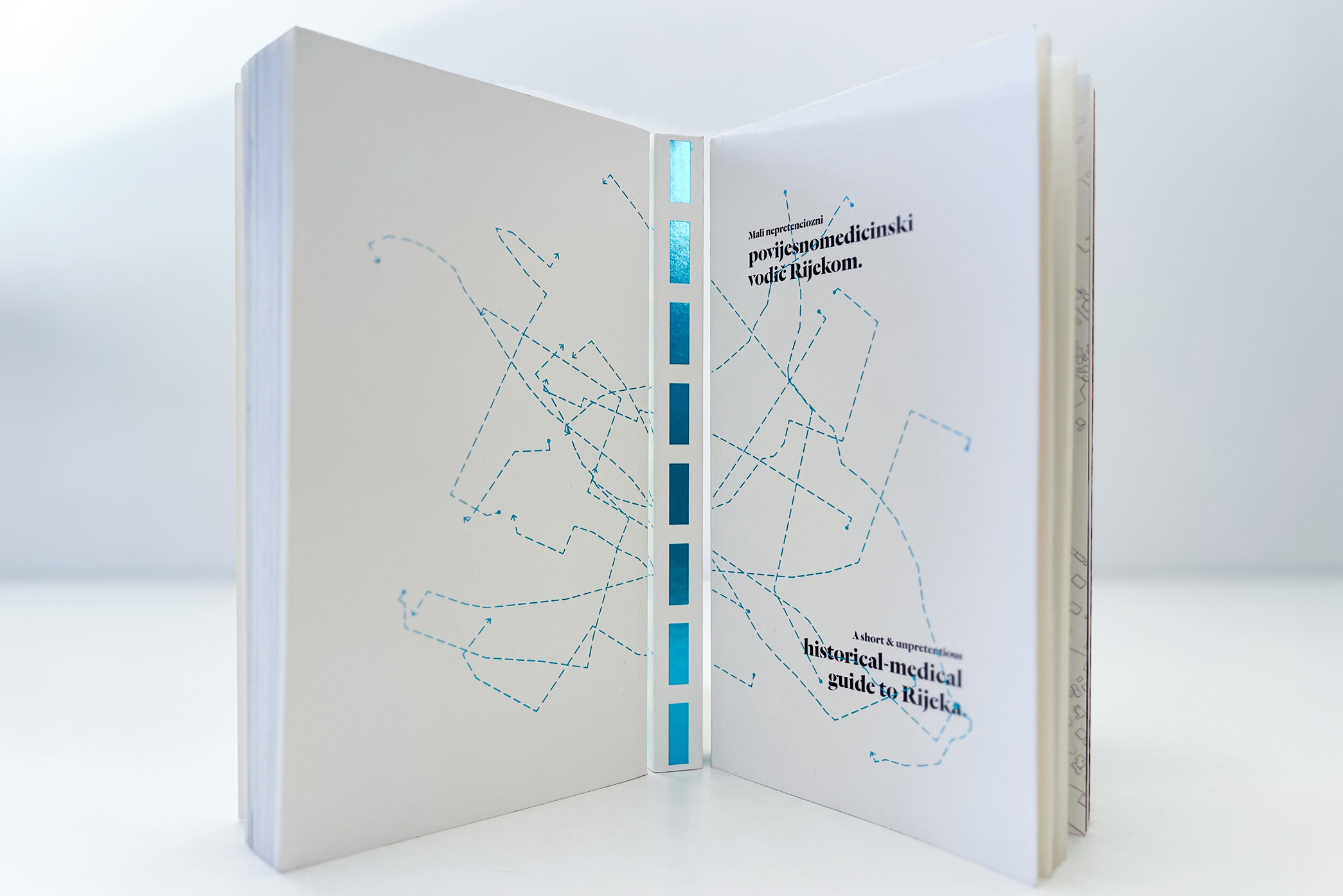 Koliko god mislimo da poznajemo svoj grad, uvijek se iznova iznenadimo koliko tu zapravo ima slojeva. Bila je prava milina otkrivati povijesnomedicinsku stranu Rijeke, a još veća dizajnirati takav vodič gradom. U dizajnu Malog nepretencioznog povijesnomedicinskog vodiča Rijekom trebali smo pomiriti 3 vrste sadržaja: narativni dio, vodički dio (mape grada) i fotografije punktova. Inspiraciju smo potražili i u starim medicinskim udžbenicima otkud smo preuzeli neke tipografske cake, a posao su nam olakšale ooodlične fotke Ivana Vranjića, koje smo ponegdje i secirali. Sve skupa objedinjeno pod konceptom “anatomija grada” nastala je knjiga na koju smo prilično ponosni. Kako nepretenciozno od nas.